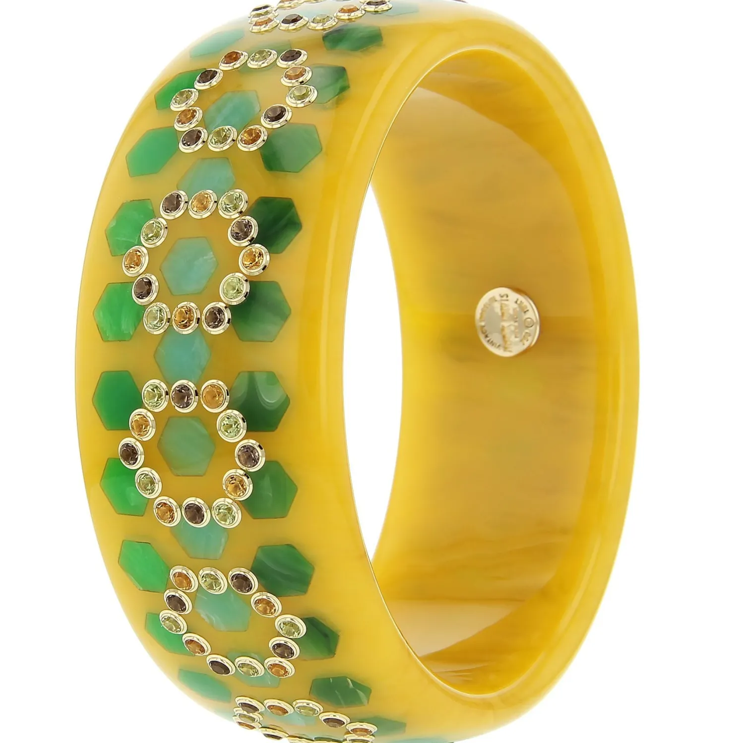Mark Davis Vintage Bakelite Bangle with Hexagonal Inlay Detailing with Citrine, Peridot and Smoky Quartz set in Yellow Gold. Each Mark Davis Piece is One-of-a-Kind and Sustainably Produced in South Carolina.