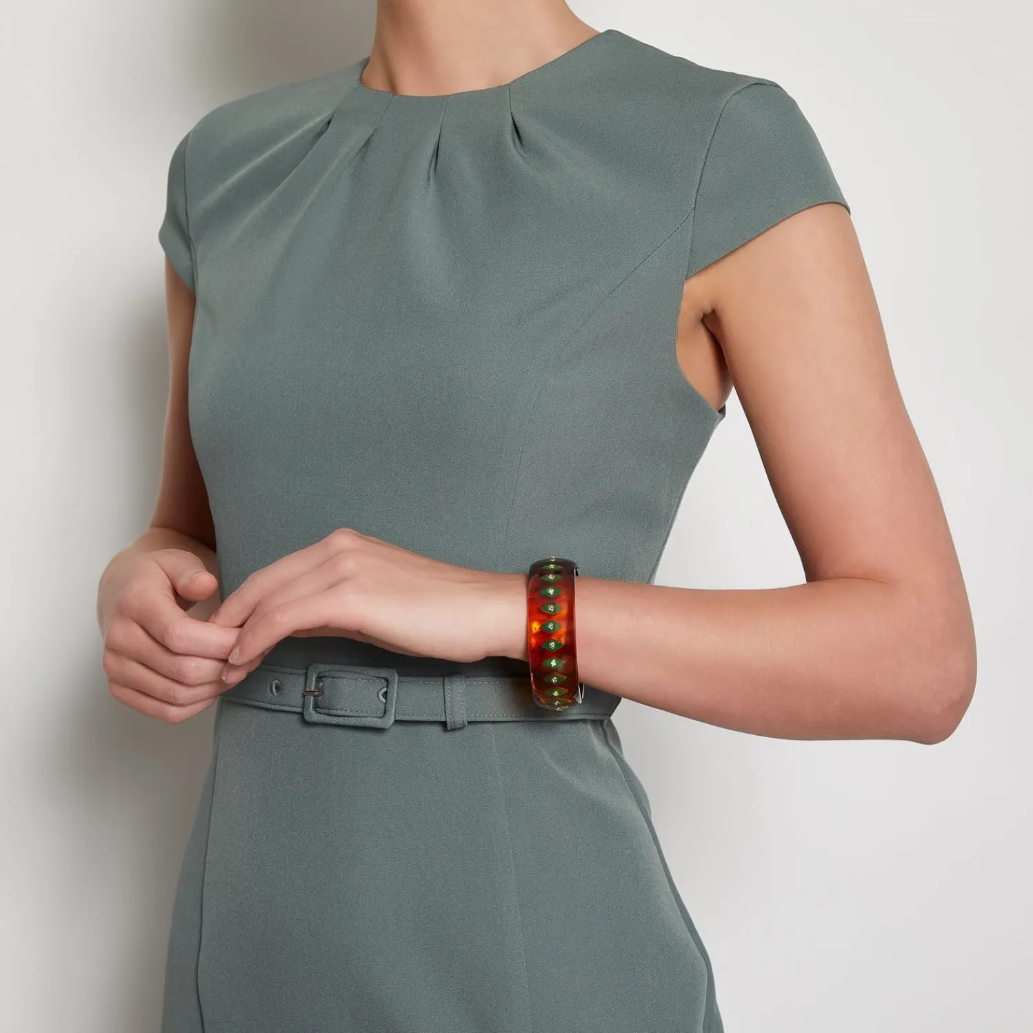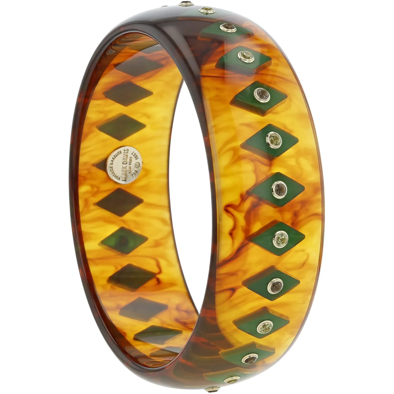 Mark Davis Vintage Bakelite Bangle with Diamond Shaped Inlay Detailing, Peridot and Smoky Quartz set in Yellow Gold. Each Mark Davis Piece is One-of-a-Kind and Sustainably Produced in South Carolina.