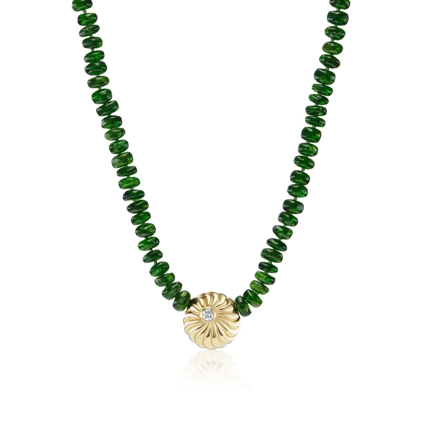 BECK Beaded Diopside necklace with white diamond and yellow gold Sol pendant.