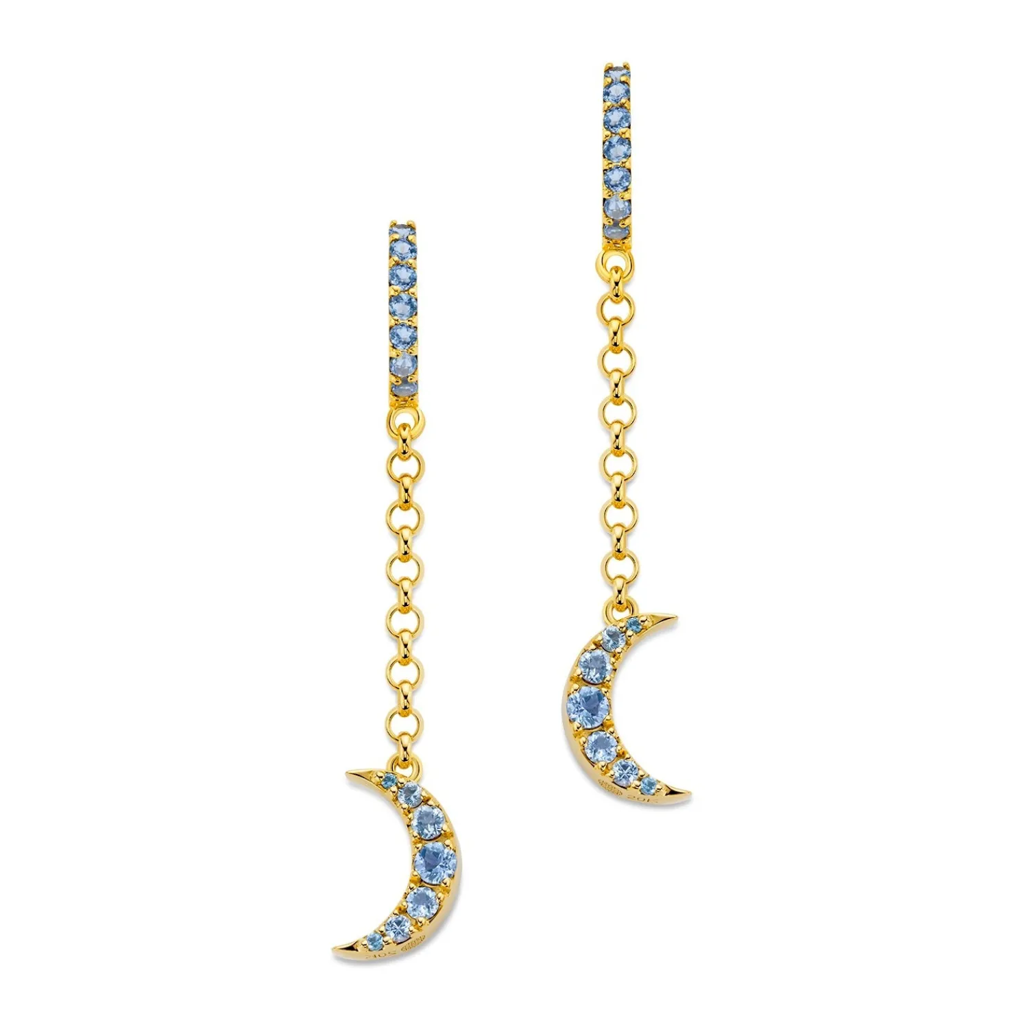 Buddha Mama Moon drop earrings with pavé tanzanite huggie earrings and blue sapphire pavé moons dangling from tiny chains. Snap back closure. Sold as a pair.