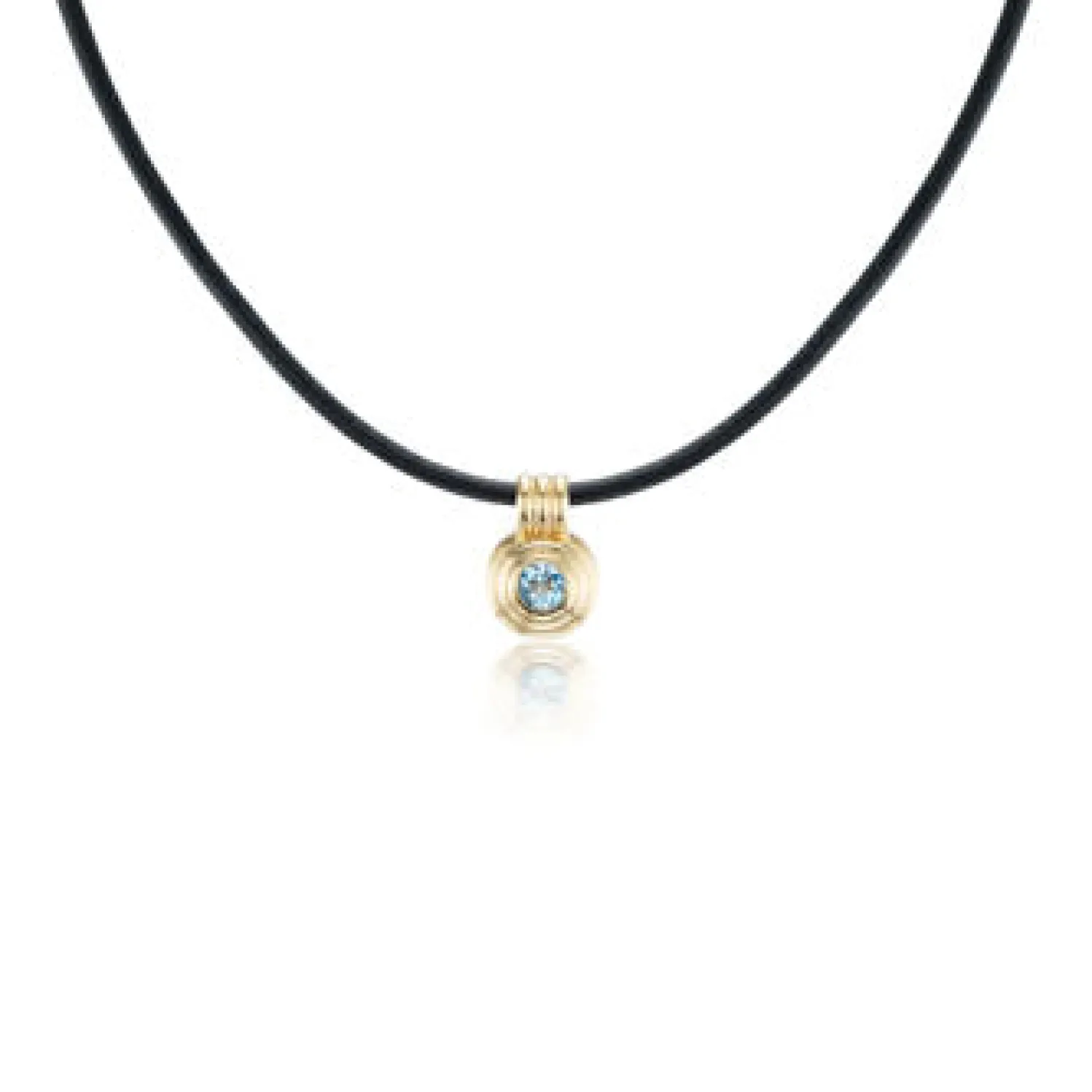 BECK Ripple Choker with Round Cut Blue Topaz on Black Leather and Yellow Gold Cord.
