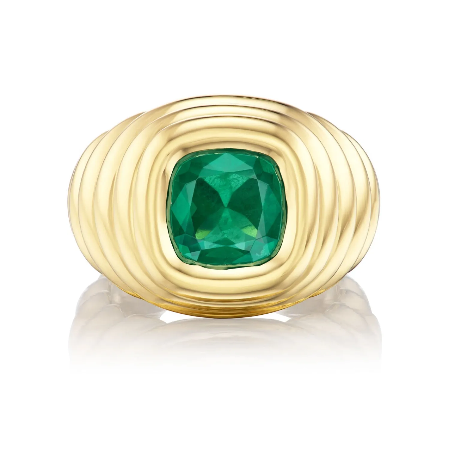 BECK Brazilian Emerald Ripple Ring with Cushion Cut Brazilian Emerald in Yellow Gold. This piece is one of a kind but can be sized.
