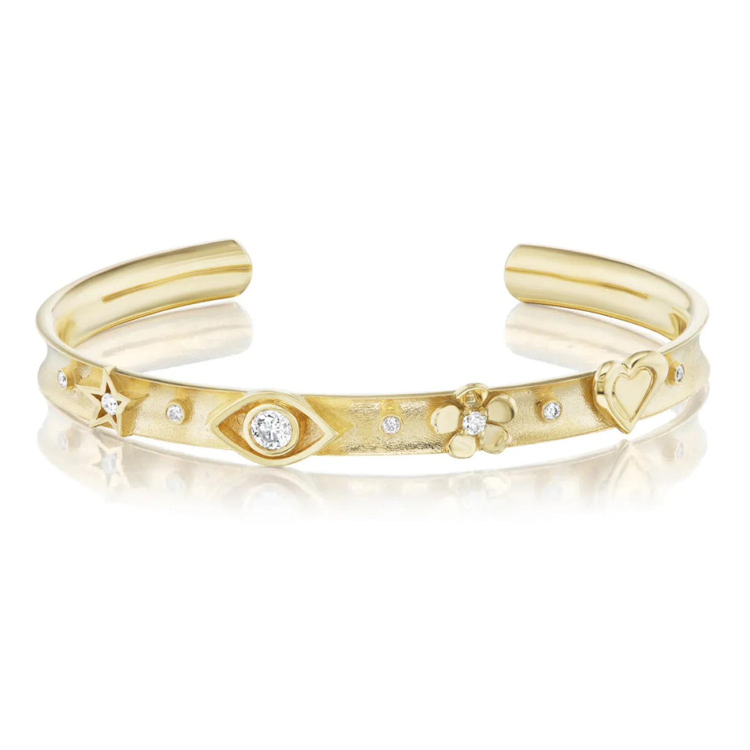 Charming cuff bracelet with eye, heart, and star shapes embellished with white diamonds.
