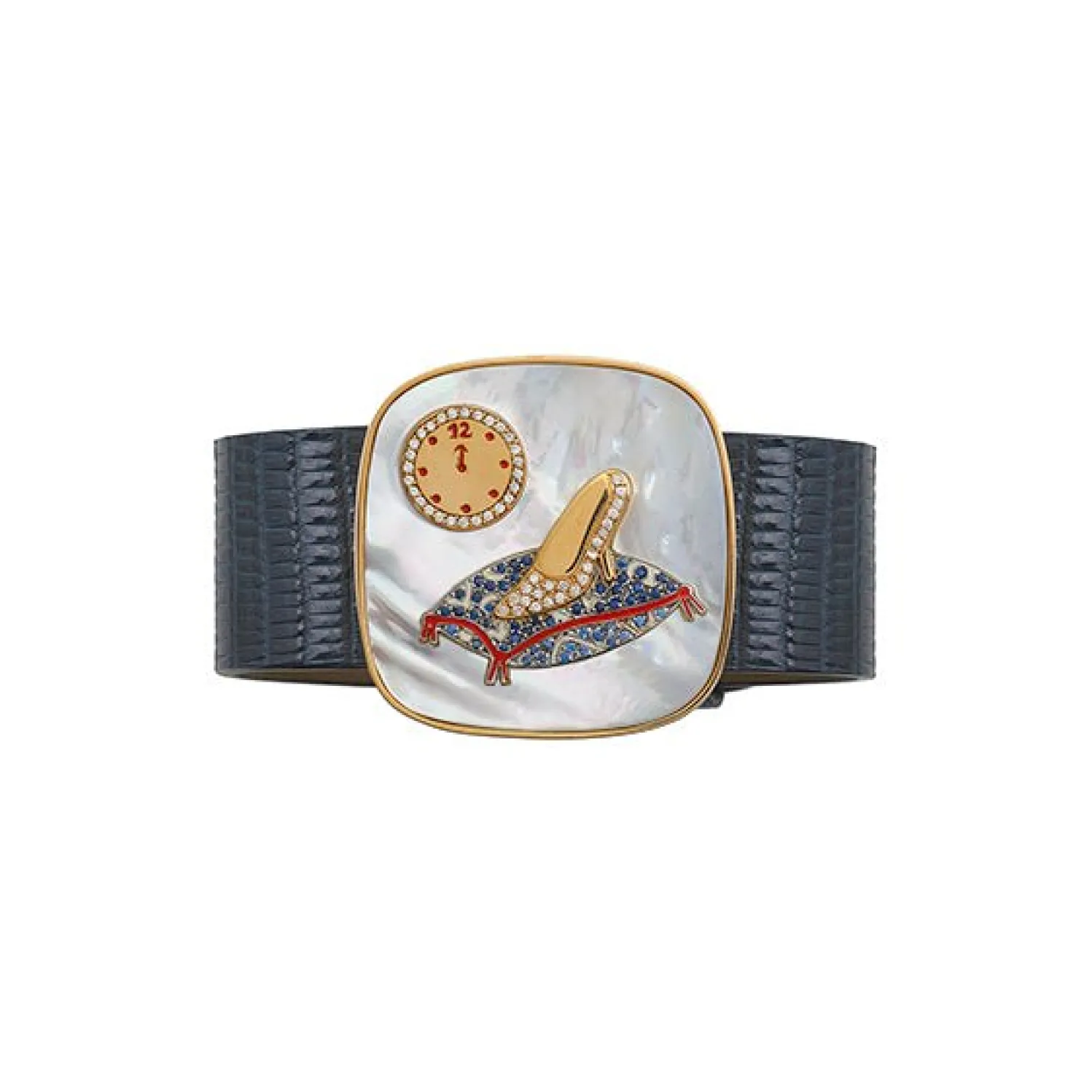 Francesca Villa Cinderella Bracelet with Hand-cut Mother-of-Pearl, White Diamonds and Blue Sapphires in Rose Gold. Enamel Accents Throughout. Scene Depicting Cinderella’s Glass Slipper Resting on a Pillow Just as the Clock Strikes Midnight. Fixed on Adjustable Leather Strap. One-of-a-Kind.