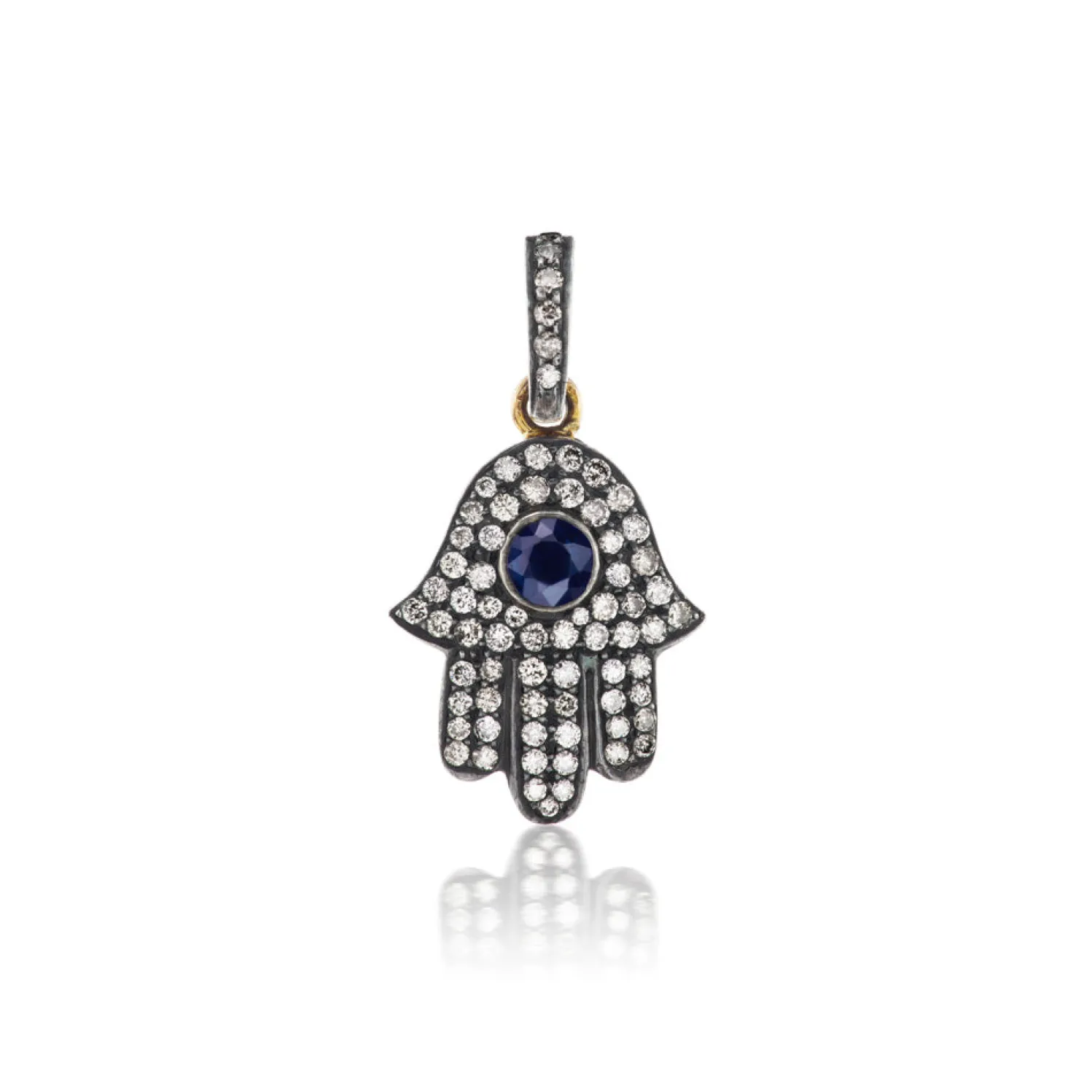 Blackened silver and diamond Hamsa charm with sapphire center and diamond bail.