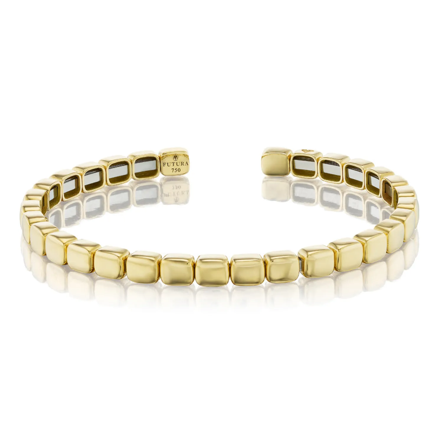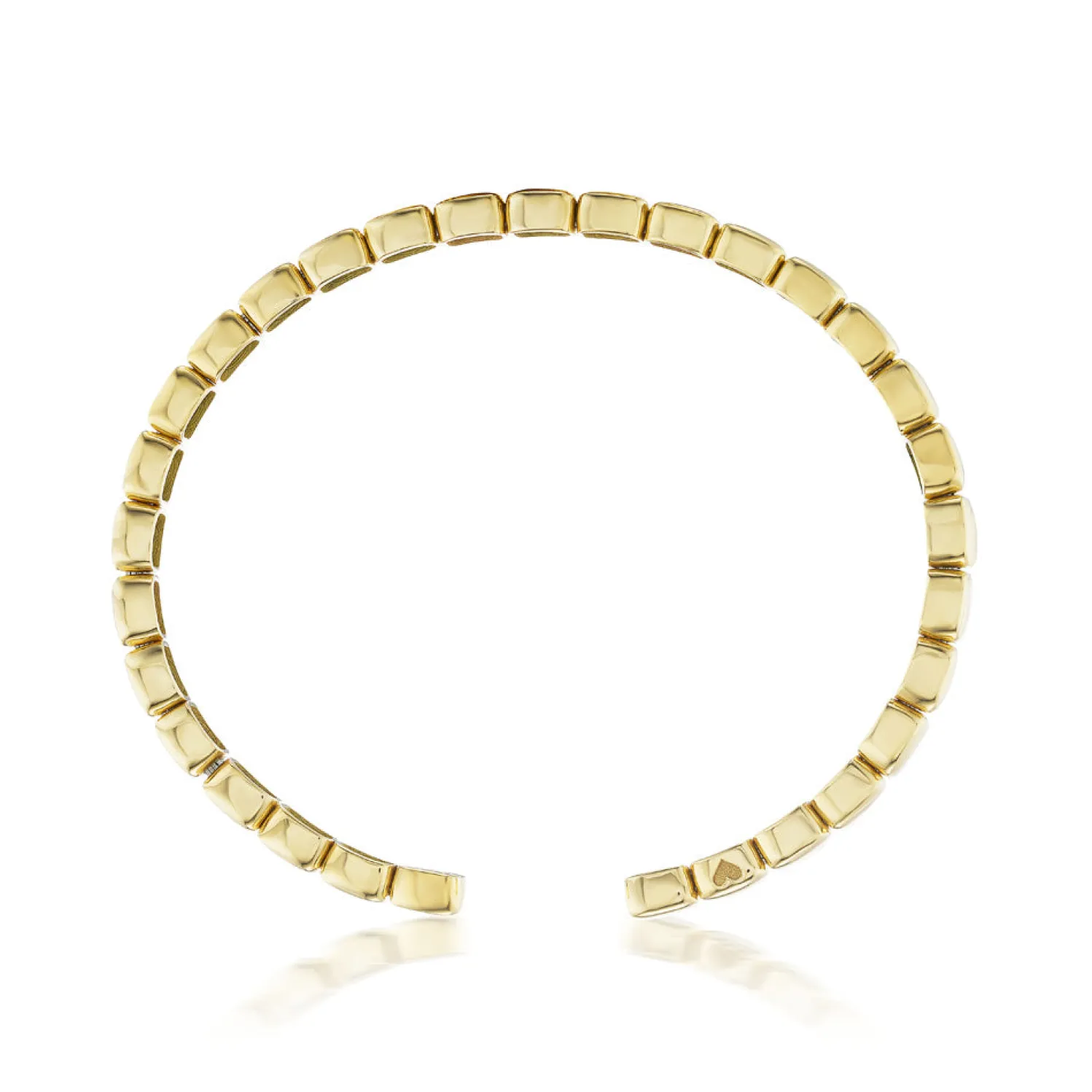 Open yellow gold cuff bracelet made of articulated yellow gold cubes with engraved heart.