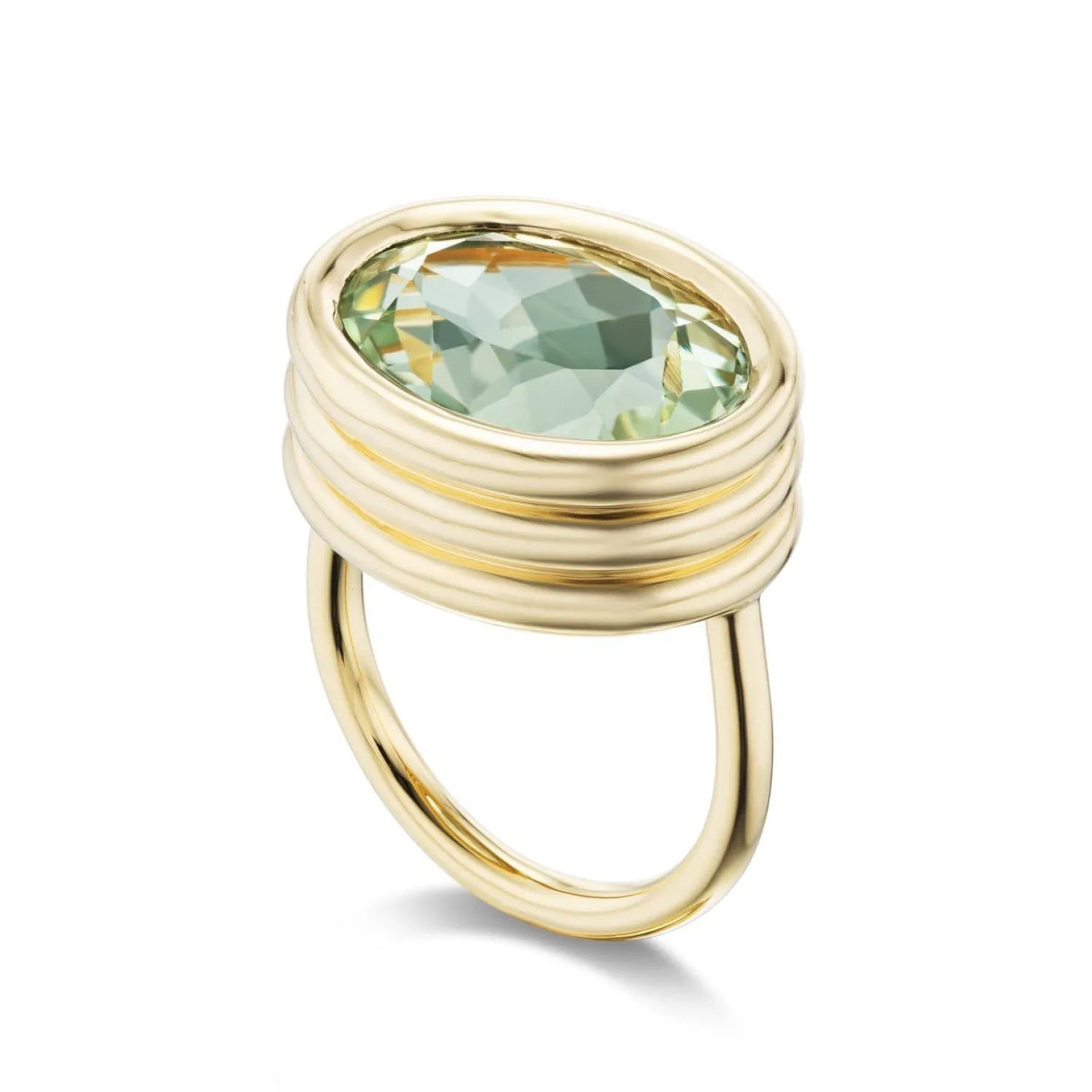 BECK Scuba Statement Ring with Oval Cut Green Amethyst and Yellow Gold Setting.