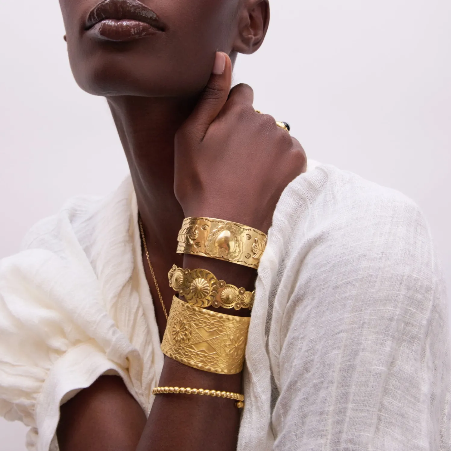 Christina Alexiou hammered yellow gold heart cuff bracelet with feather detailing.