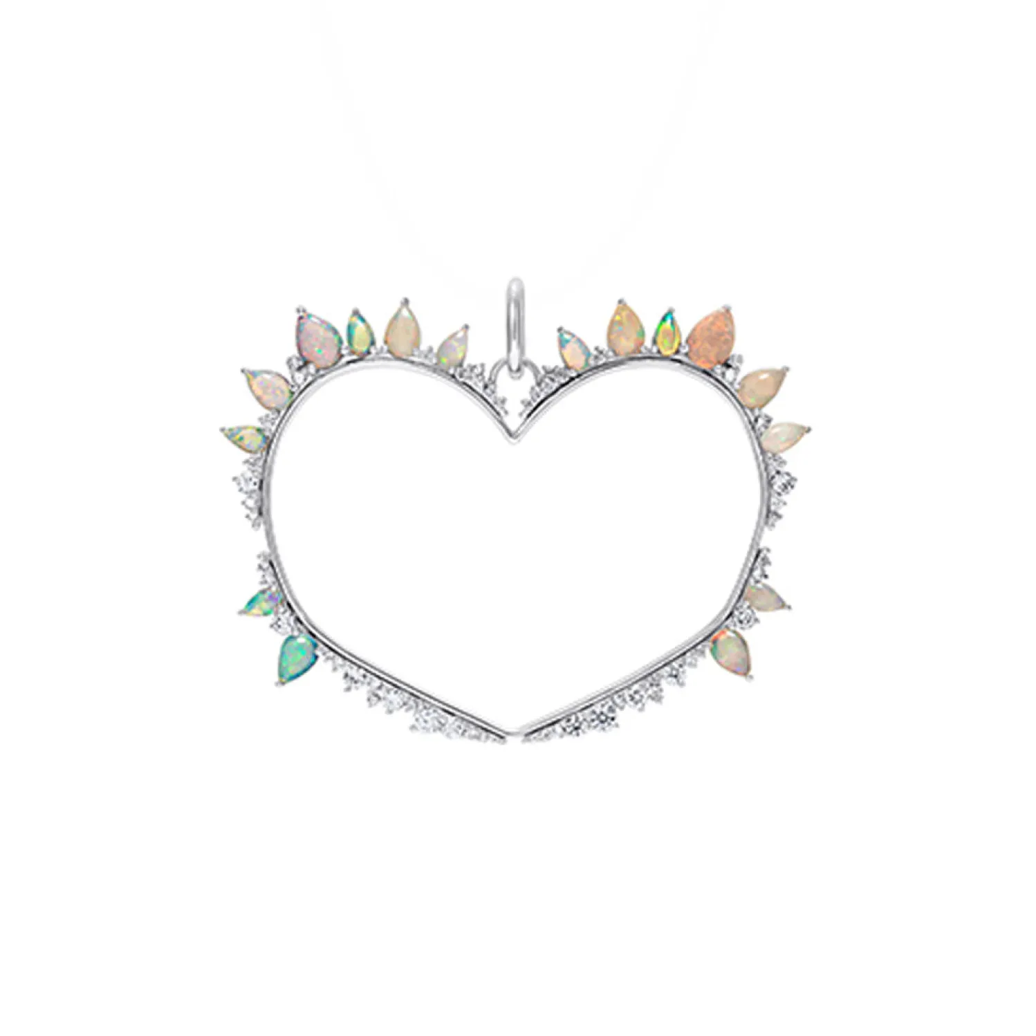 White gold large open heart charm with various sizes of drop-cut opals and diamonds.