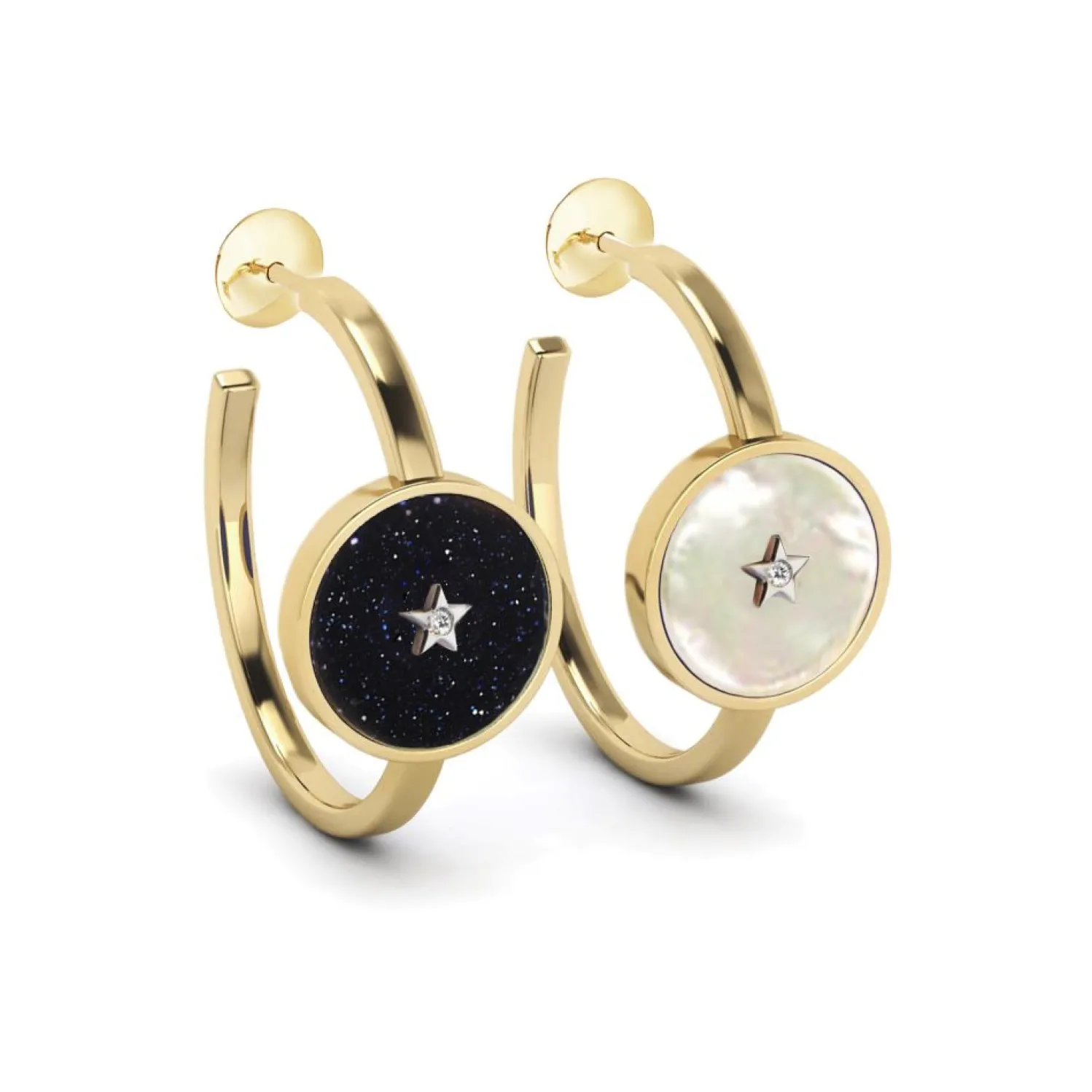 Yellow gold hoop earrings with mother of pearl and aventurine glass and white gold diamond center star.
