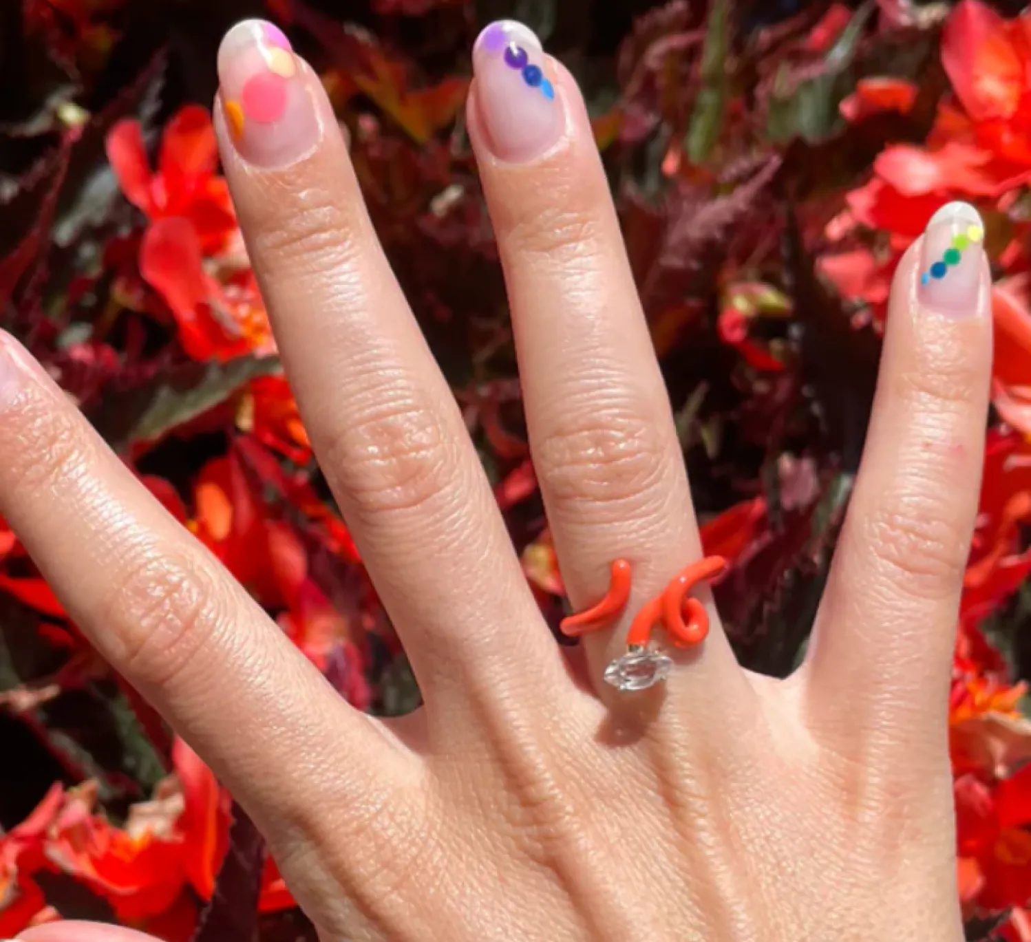 Bea Bongiasca Baby Vine ring with hand-painted Japanese orange enamel and marquise cut rock crystal.