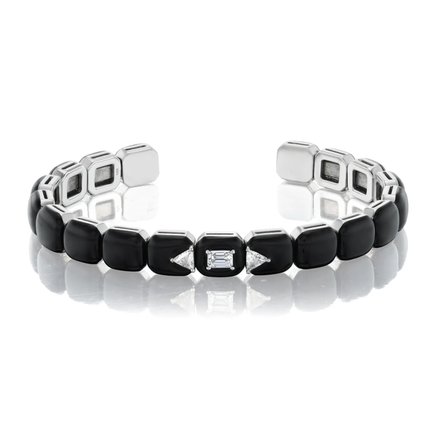 Striking open cuff made of black enamel rectangles with emerald and trillion cut white diamonds.