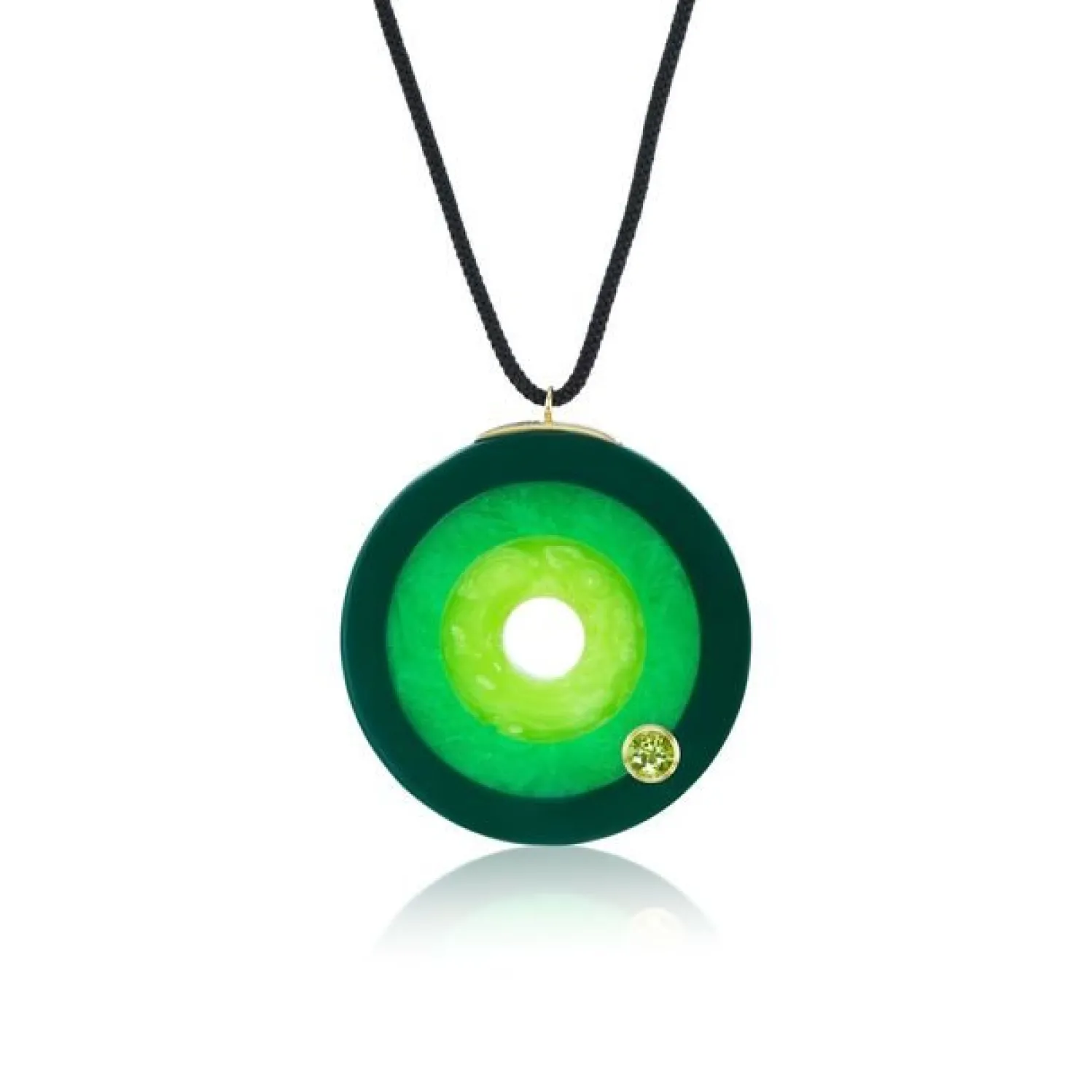 Mark Davis vintage bakelite bullseye pendant with peridot on black cord.