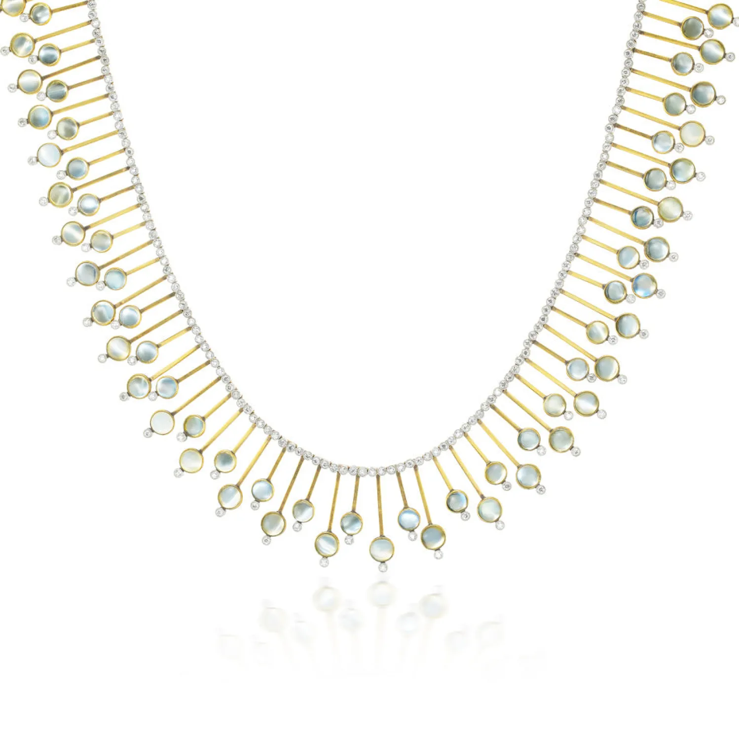 Beautiful 1950’s platinum statement necklace with moonstone cabochons and a diamond pavé inner chain.