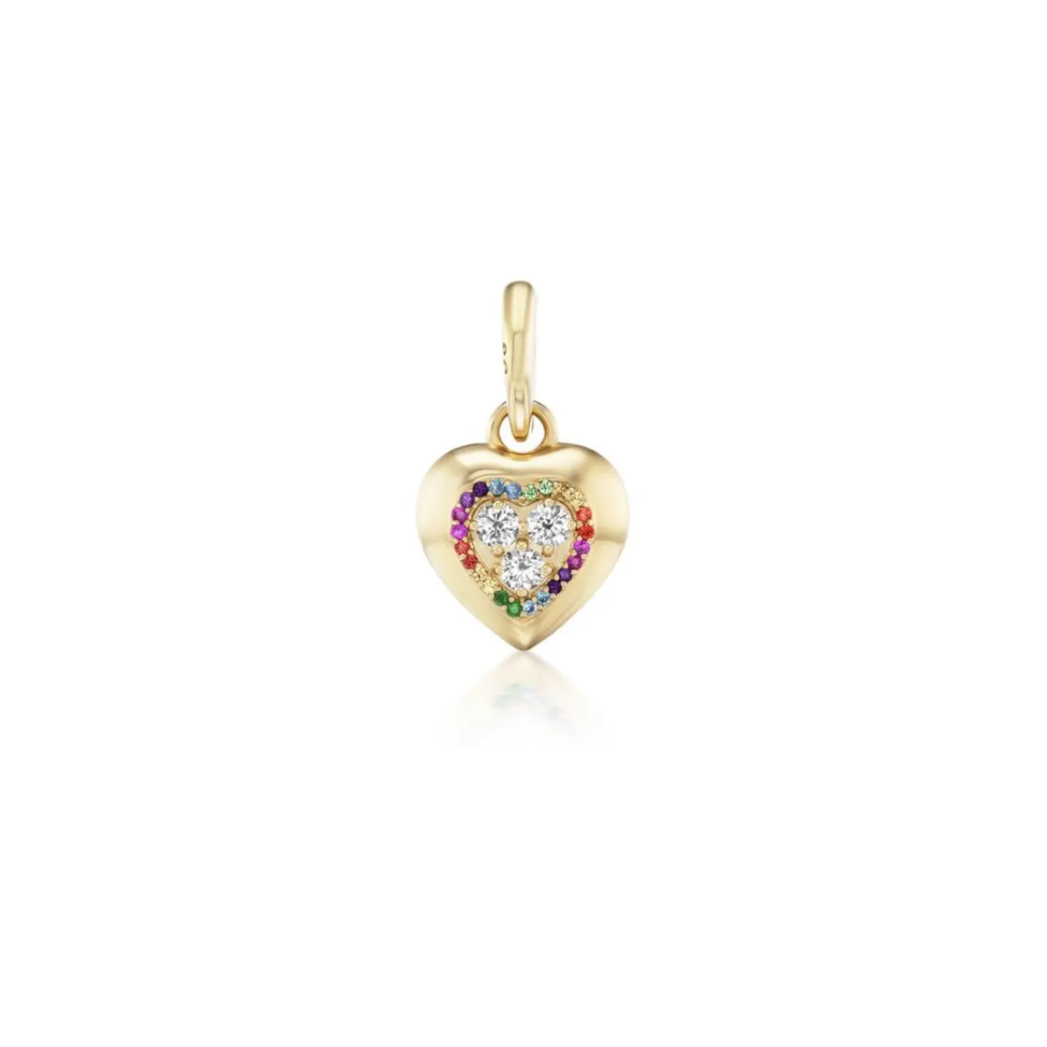 Stephanie Gottlieb Candy Heart Charm with Diamonds and Rainbow Halo. Three center diamonds with a halo of rainbow sapphires.