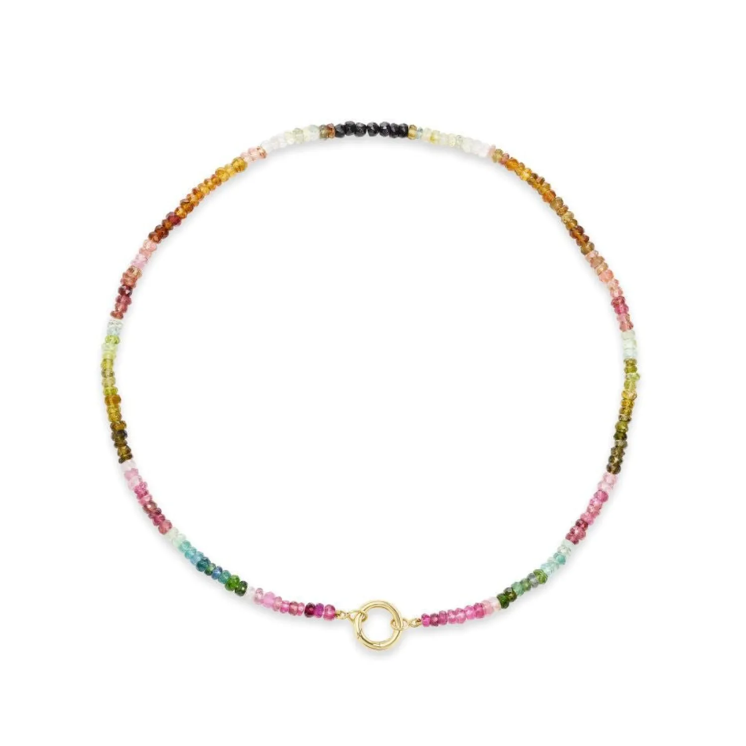 Natural multi-colored sapphire beaded necklace with yellow gold circle clasp perfect for charms.
