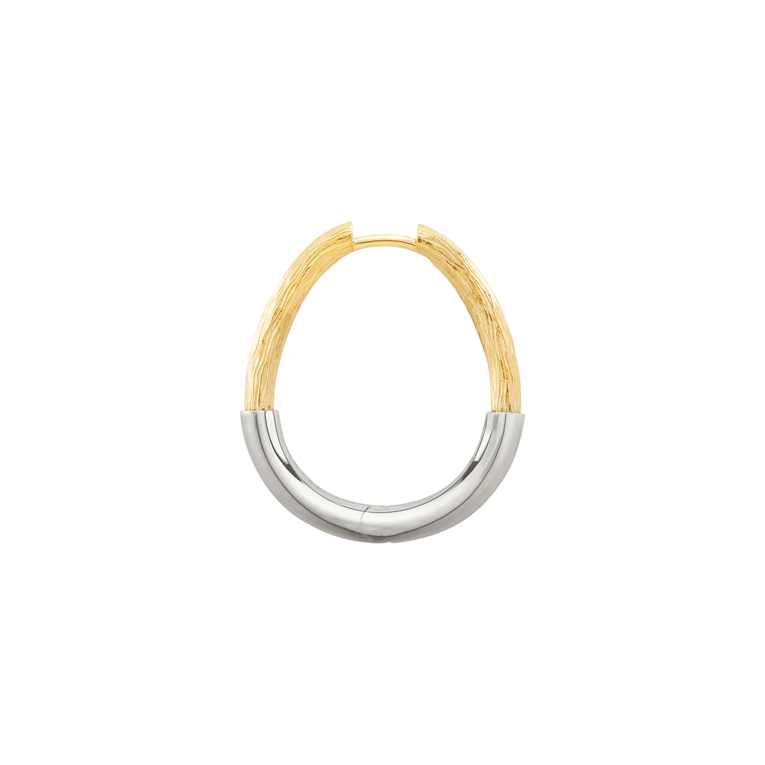 Mellerio Riviera Chasing Creole Hoop Earring In Yellow and White Gold. Beautiful Hand-chased Detailing Mimics the Look of Woodgrain. Hinged at Bottom Center. Sold as a Single.