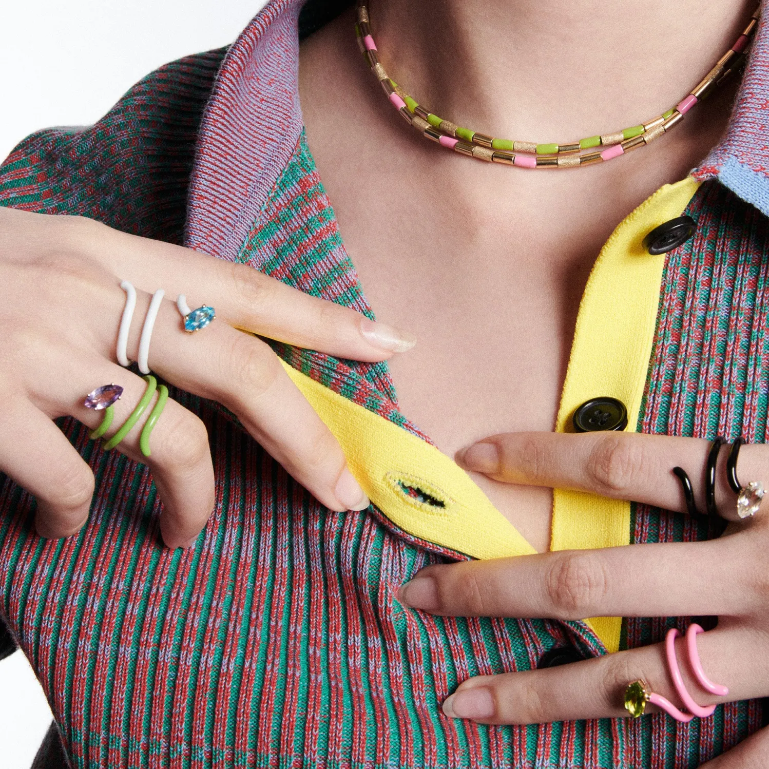 Bea Bongiasca double wrapped open ring coated with enamel with marquise cut stone.