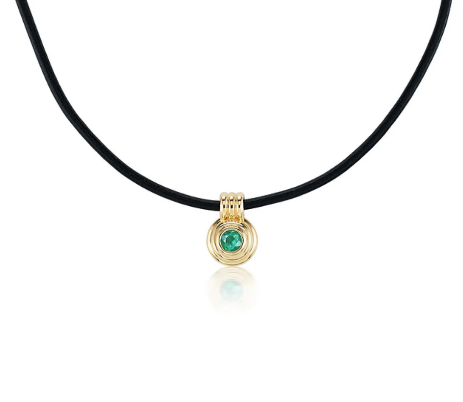 BECK Emerald Ripple Choker with Round Cut Emerald on Black Leather and Yellow Gold Cord. One-of-a-kind.