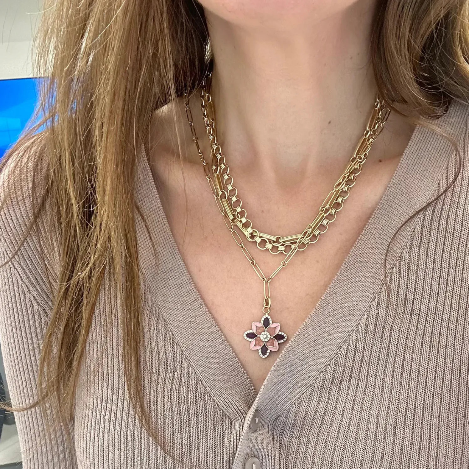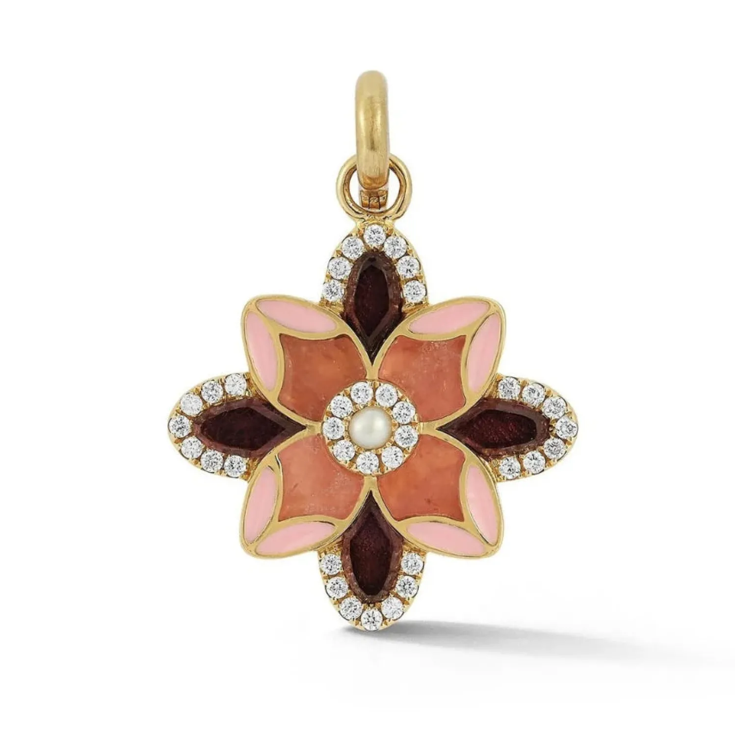 Storrow Violet flower charm features rich rubellite and rhodochrosite petals, a pearl center, diamond accents, and pink enamel crafted in yellow gold. Openable bail with safety clasp.
