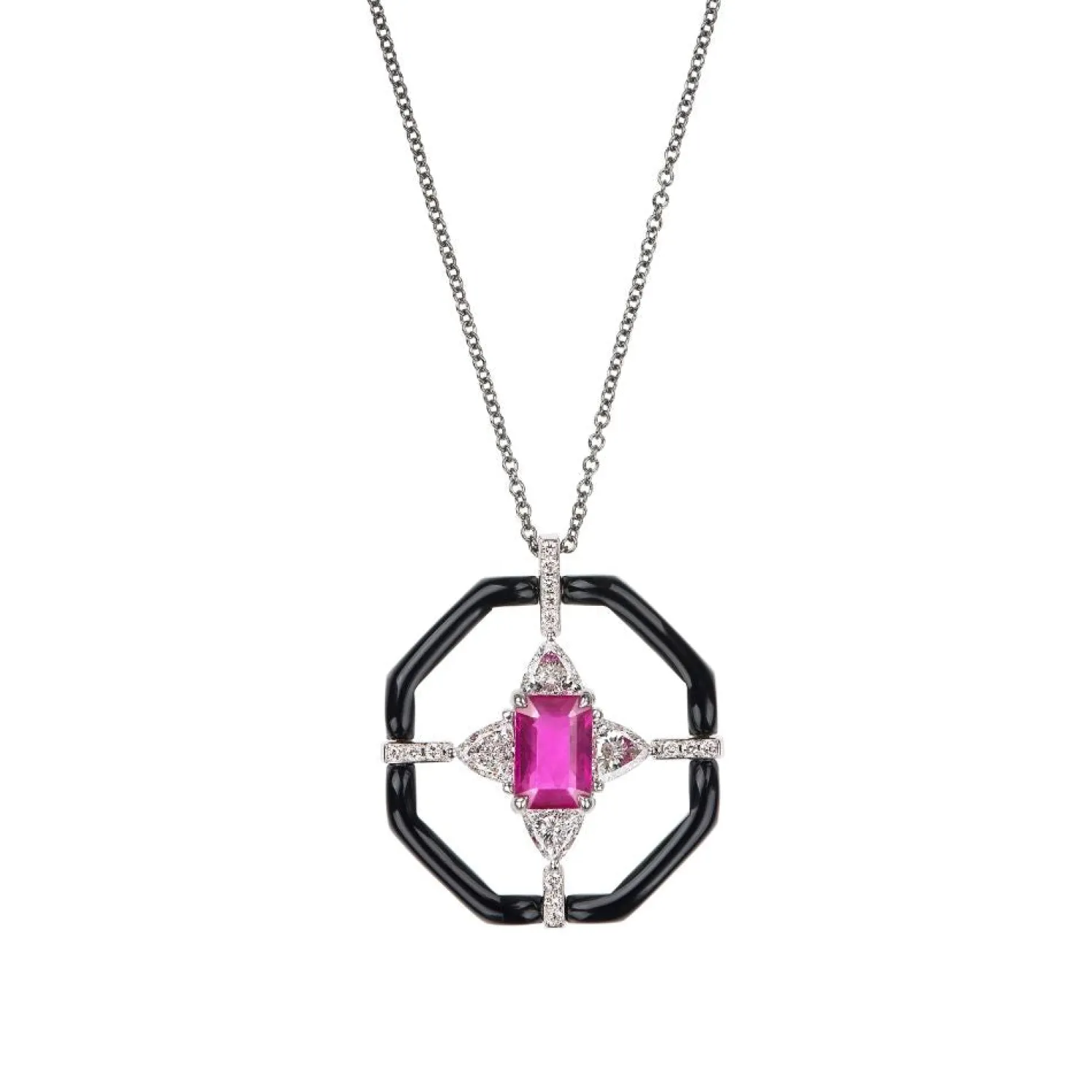 Nikos Koulis “Oui” black enamel pendant with emerald cut Mozambican ruby at center, surrounded by white diamond trillions and white diamond pave. Hand painted enamel frame the geometric design. Chain sold separately.