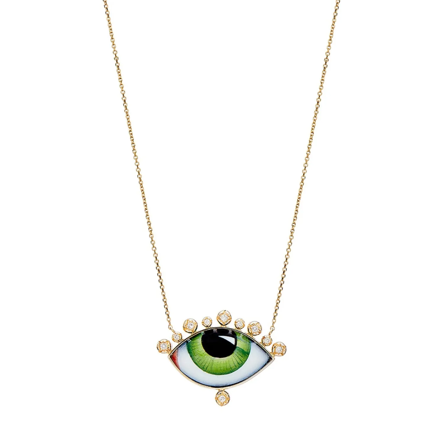 Lito Russe Grand Vert necklace with large green enameled eye and brilliant cut white diamonds.