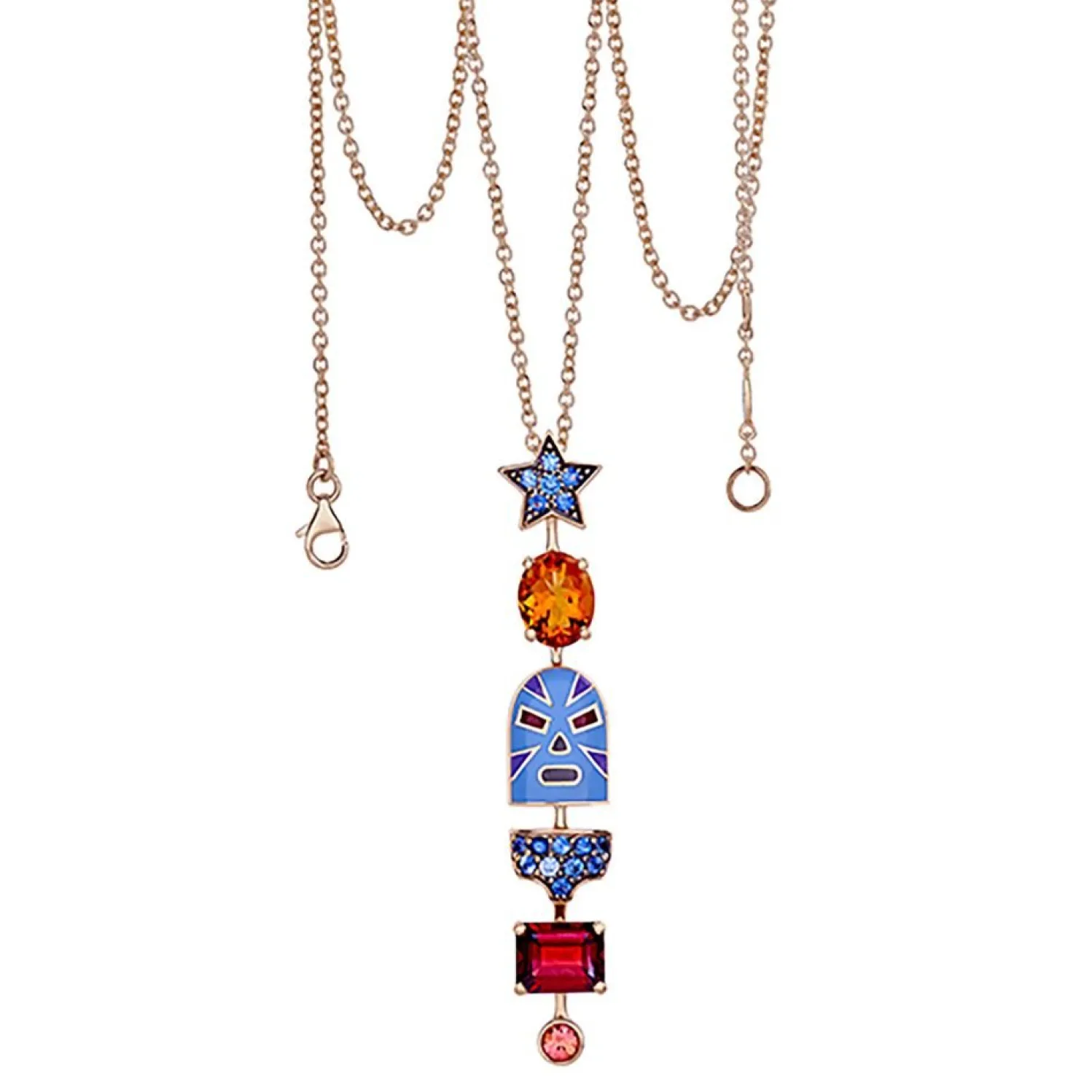 Francesca Villa “The Mankind Pendant” with Blue Enamel Luchadores Mask with Blue & Orange Sapphires, Citrine, Garnet set in Yellow Gold. Luchadores are Mexican Professional Wrestlers Known for Their Colorful Masks and Epic Feats.