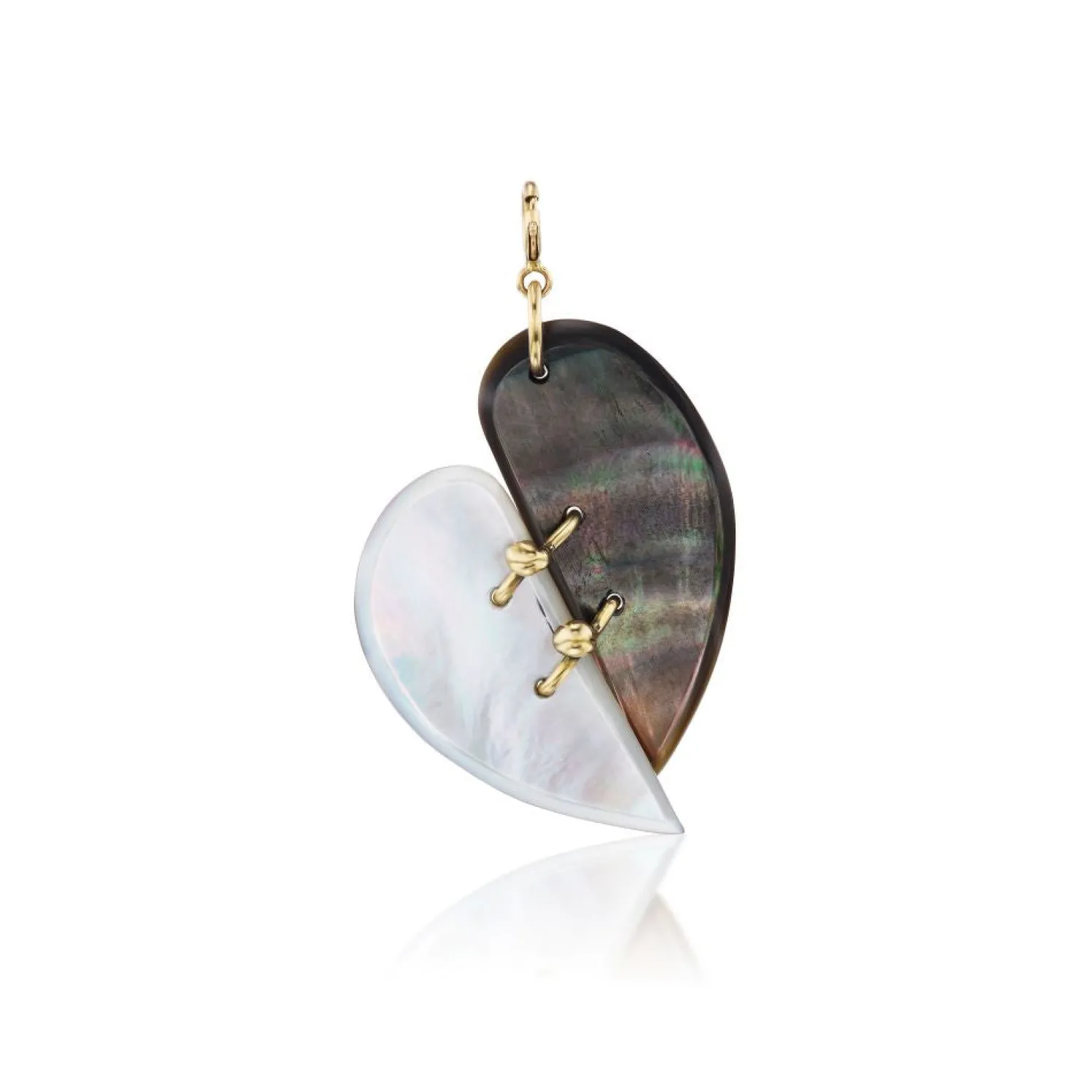 Upcycled mother of pearl dual sided heart charm with yellow gold and operable clasp.