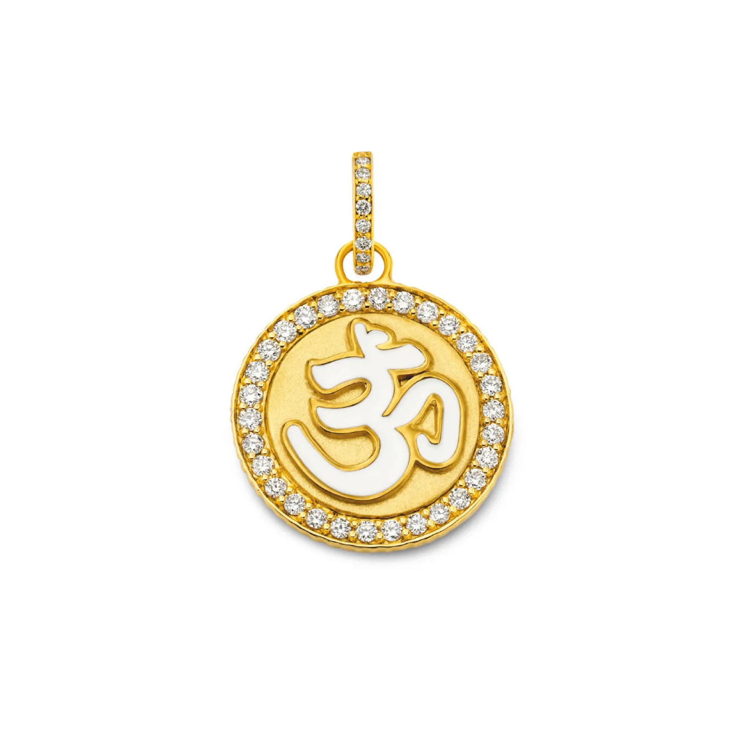 Buddha Mama OM White Diamond OM Coin Pendant in Yellow Gold with White Enamel and White Diamonds.