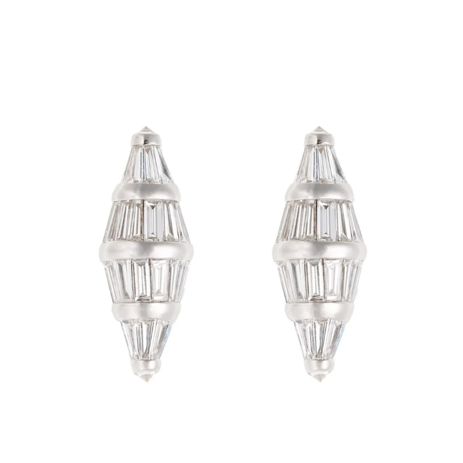 Nikos Koulis White Diamond Baguette Spectrum Revisited Large Stud in White Gold. Spectrum Collection is Inspired by the Rays of Sun and Prisms of Light. Characterized by Radiance and Sharp Geometry, Spectrum Pieces Epitomize a Cool Flair and Fierce Appeal. Following his Greek Free Spirit, Koulis revisits Spectrum with New Forms and Motifs and Interplays with Light Through the Clarity of the Diamond Baguettes and Their Tapered Cuts. Inverted Diamonds at the Top and Bottom of Each Stud are a True Nikos Detail. Push backs. Sold as a Pair.