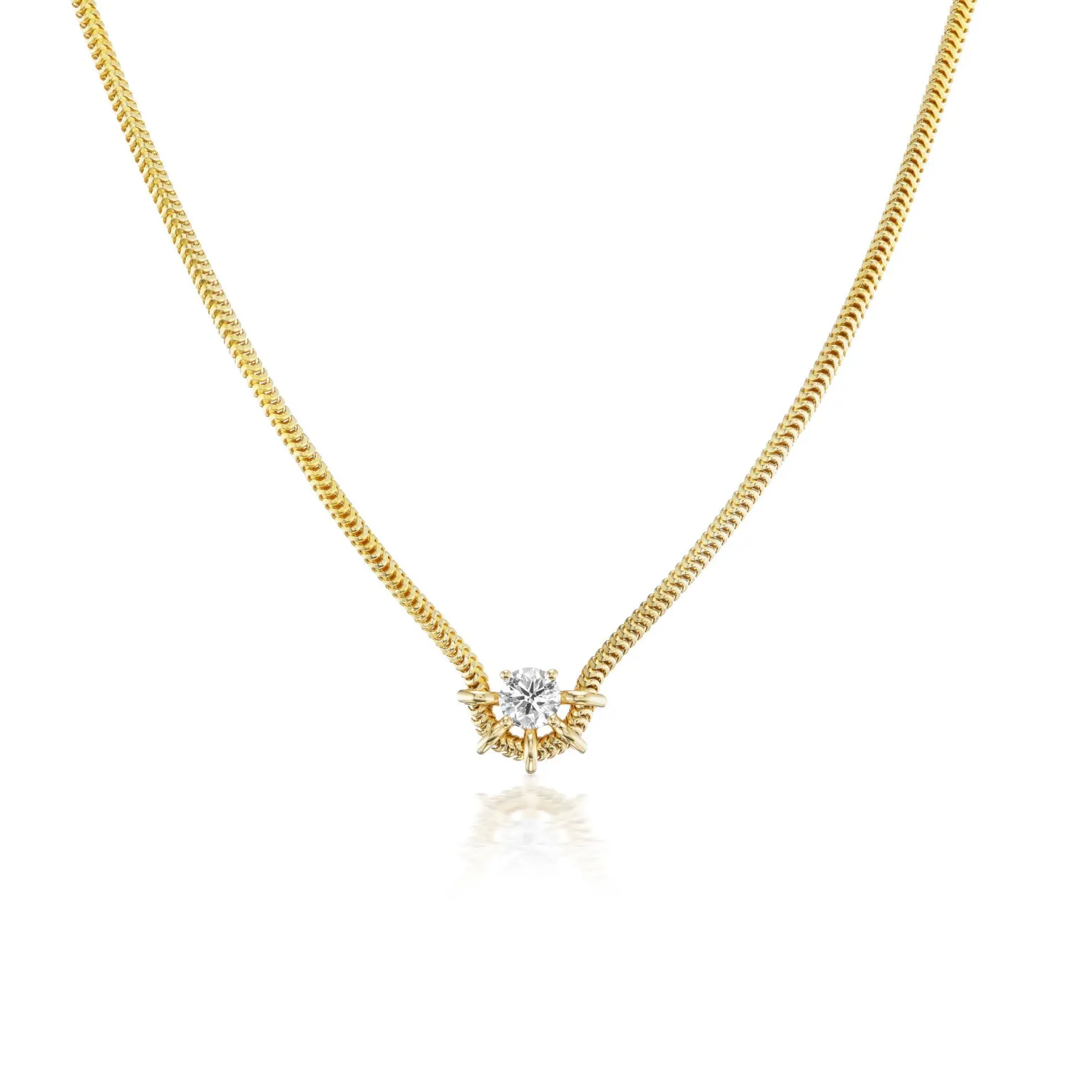 VICE VERSA Louise Necklace with Solitaire White Diamond set In Yellow Gold. A Reinterpretation of the Classic Diamond Solitaire Pendant on a Fluid Snake Chain.