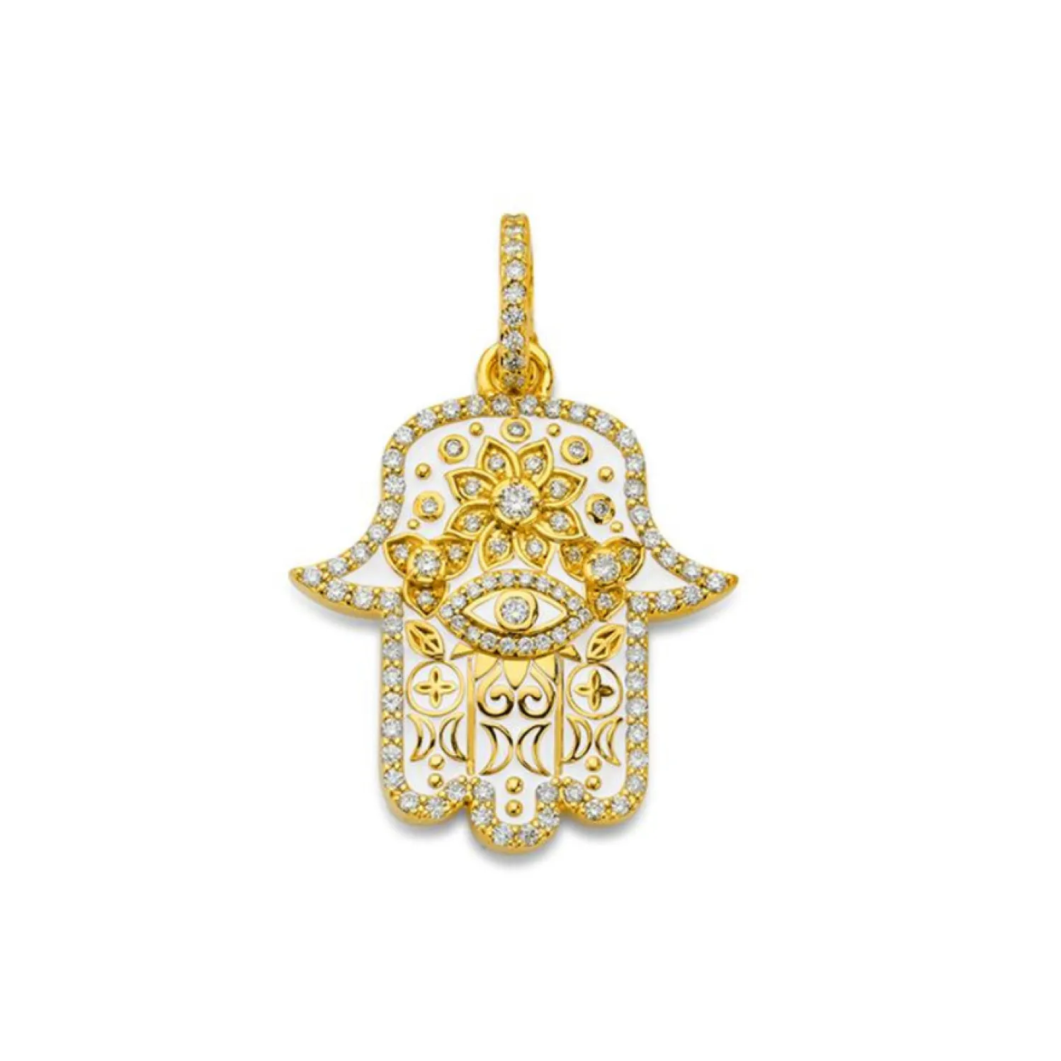 Buddha Mama White enamel hamsa pendant with white diamond frame and accents throughout. Openable diamond bale.